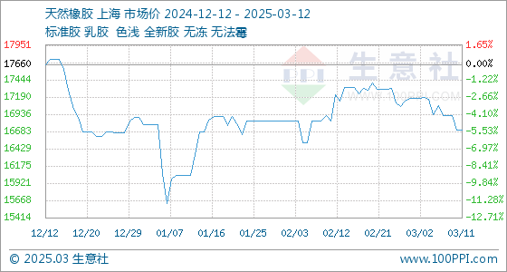 3月12日,生意社天然橡胶基准价为16709.00元/吨,与本月初(17166.00元/吨)相比,下降了-2.66%。