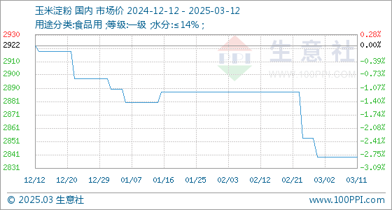 3月12日生意社玉米淀粉基准价为2840.00元/吨