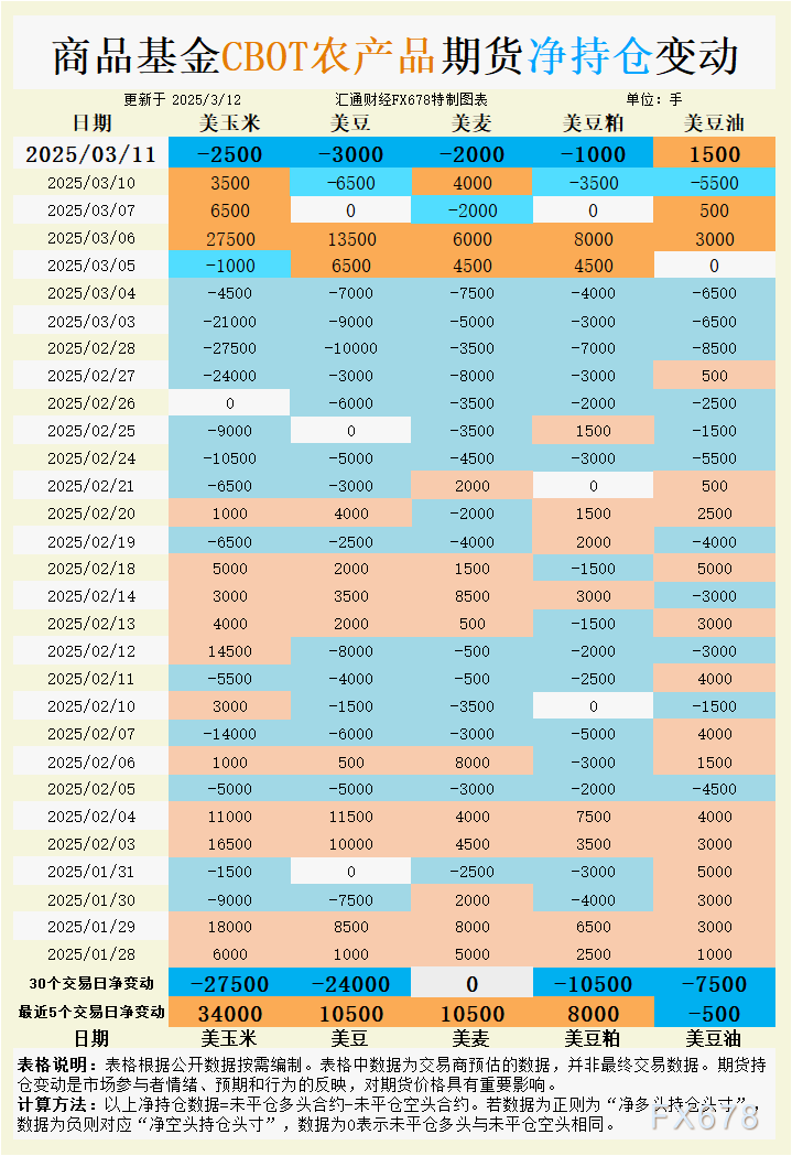 增加CBOT玉米投机性净多头;增加CBOT大豆投机性净多头;增加CBOT小麦投机性净多头;增加CBOT豆粕投机性净多头;增加CBOT豆油投机性净空头;