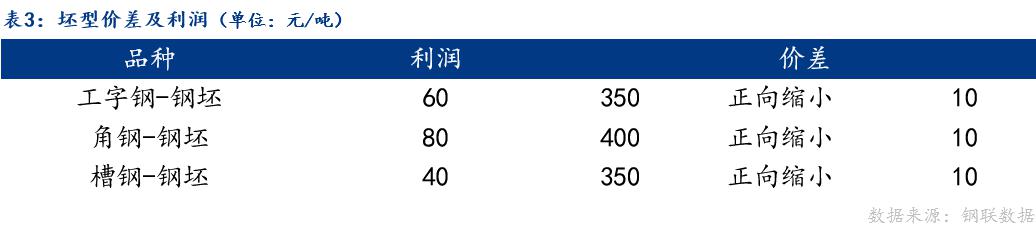从坯型价差来看,今日工字钢角钢槽钢与钢坯价差正向缩小。
