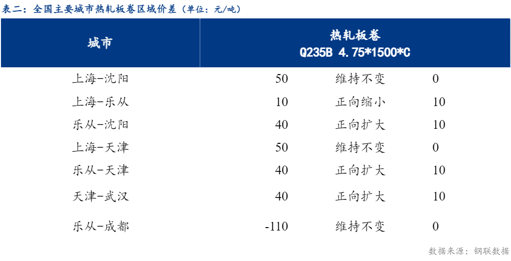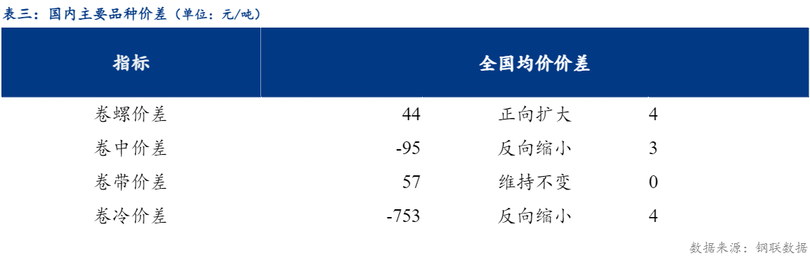 从品种价差来看,卷螺价差较上一交易日正向扩大4元/吨,卷中价差较上一交易日反向缩小3元/吨 ,卷带价差较上一交易日持平 ,热冷价差较上一交易日反向缩小4元/吨 。
