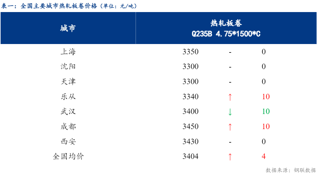 今日热轧板卷全国主要城市价格稳中有涨,截止发稿时3.0mm热轧板卷全国均价3458元/吨,较上个交易日上涨3元/吨。4.75mm热轧板卷全国均价3403元/吨,较上个交易日上涨3元/吨。今日黑色商品期货小幅反弹,热卷05合约收涨0.63%,早盘价格以稳为主,午后期货上行,部分市场价格上调,但涨后成交受阻。