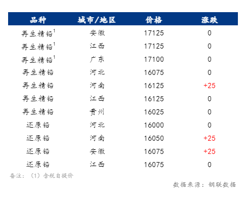 广西市场A企业再生精铅现金价16000元/吨出厂少量成交,反映出货不畅。