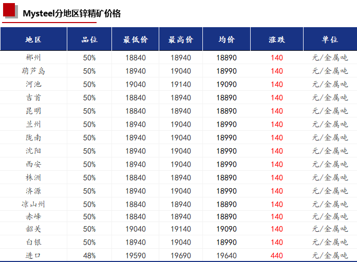 今日受锌价的影响,锌精矿价格上涨140元/金属吨。国内锌精矿加工费各地区暂未调整,和上一交易日持平。进口TC市场主流报价在10-30美元/干吨,暂无波动。