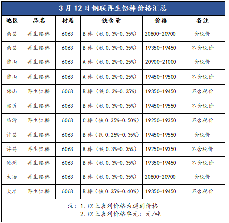 3月12日A00铝锭现货价华东20900,涨190;华南20900,涨200;中原20780,涨180(单位:元/吨)。铝价大幅上涨,再生铝棒企业下调价格接单与挺价接单举措并存,今日再生铝棒价格跟盘上涨100-150元/吨。
