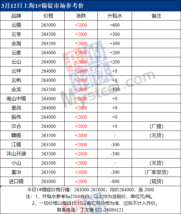 3月12日Mysteel上海现货锡锭报价263000-265000元/吨,均价264000元/吨,较上一交易日涨2000元/吨。Mysteel15:30上海现货锡锭成交价格263000-265000元/吨,均价264000元/吨,较上一交易日涨1500元/吨。