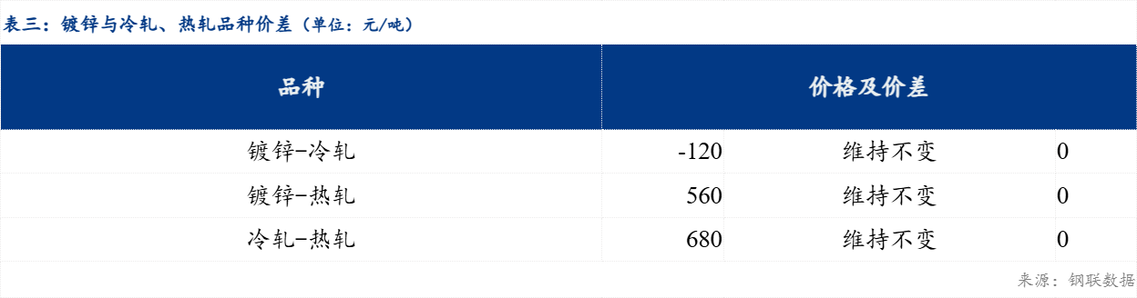 区域价差来看,天津-沈阳冷轧板卷区域价差维持不变,沈阳-哈尔滨冷轧板卷区域价差维持不变;天津-沈阳镀锌板卷区域价差维持不变,沈阳-哈尔滨镀锌板卷区域价差维持不变。品种价差来看,镀冷品种价差维持不变 ;镀热品种价差维持不变;冷热品种价差维持不变。