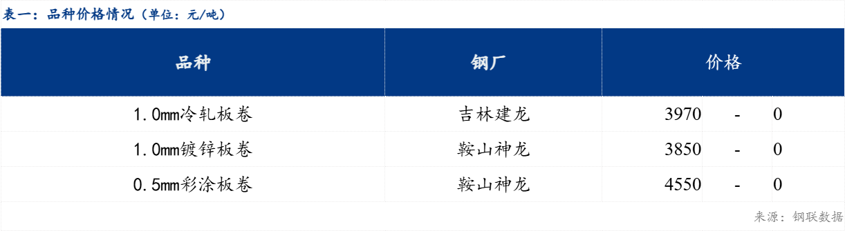 沈阳市场冷轧镀锌价格持稳运行,现东北主流市场冷轧板卷价格3970元/吨,镀锌板卷价格3850元/吨,彩涂板卷价格4550元/吨。具体来看,市场方面,今日热卷期货盘面先抑后扬,现货市场报价基本平盘,贸易商手头库存偏低,但是下游需求不足。心态方面,目前市场需求恢复持续性不强,贸易商仍持谨慎观望态度为主。综合来看,预计下一交易日东北市场冷轧及镀锌板卷价格或以稳为主。