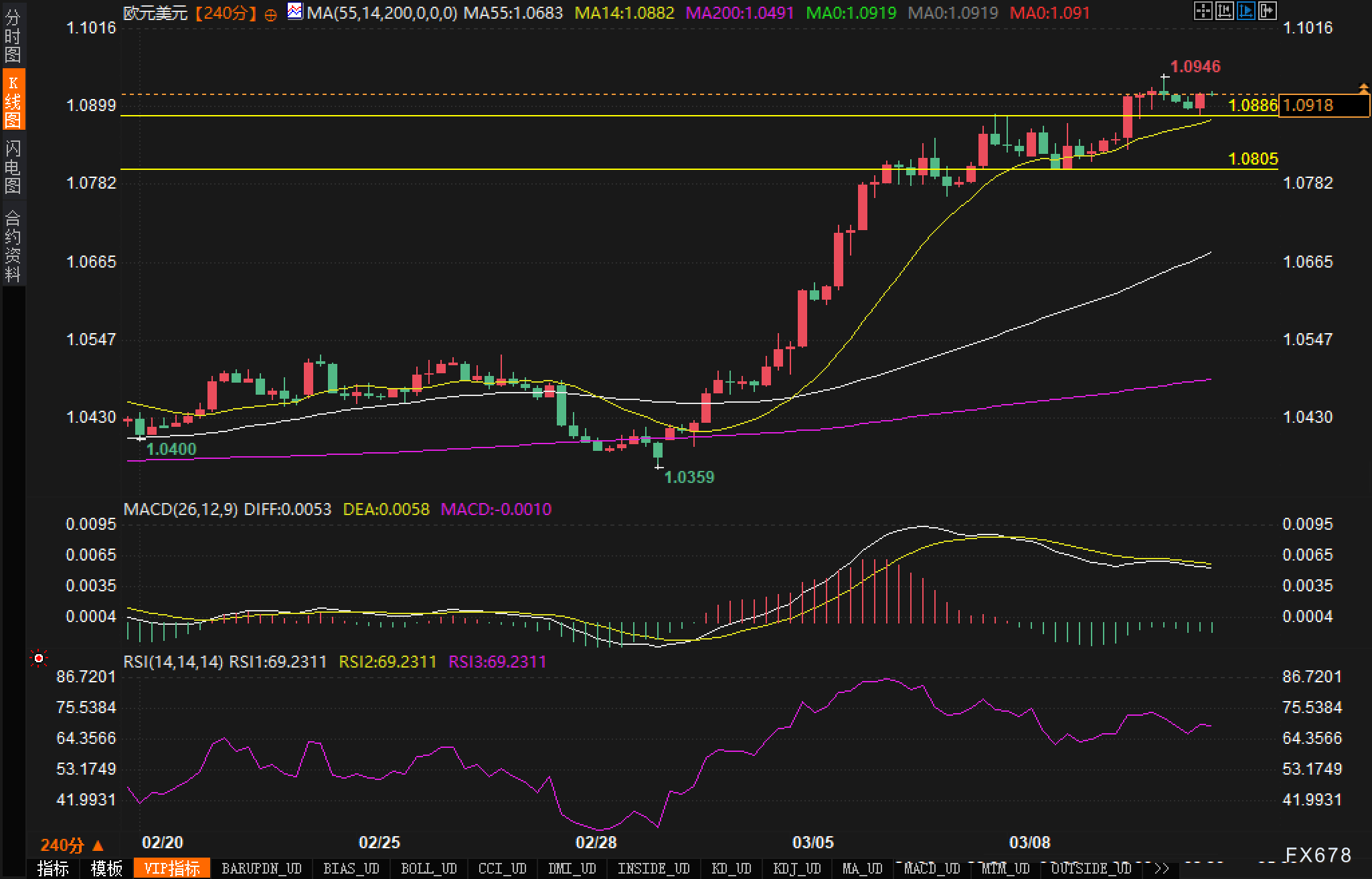 汇通财经APP讯——周三(3月12日)欧洲交易时段,欧元/美元汇率呈现盘整迹象,但仍处于1.09关口上方。近期市场背景复杂多变,地缘政治以及国际经济局势持续发酵,成为了牵动外汇市场敏感神经的主因。欧元/美元近日表现出较强的波动性,整体仍处于明显的上涨趋势中,然而短期内能否持续攀升成为了市场的疑问。