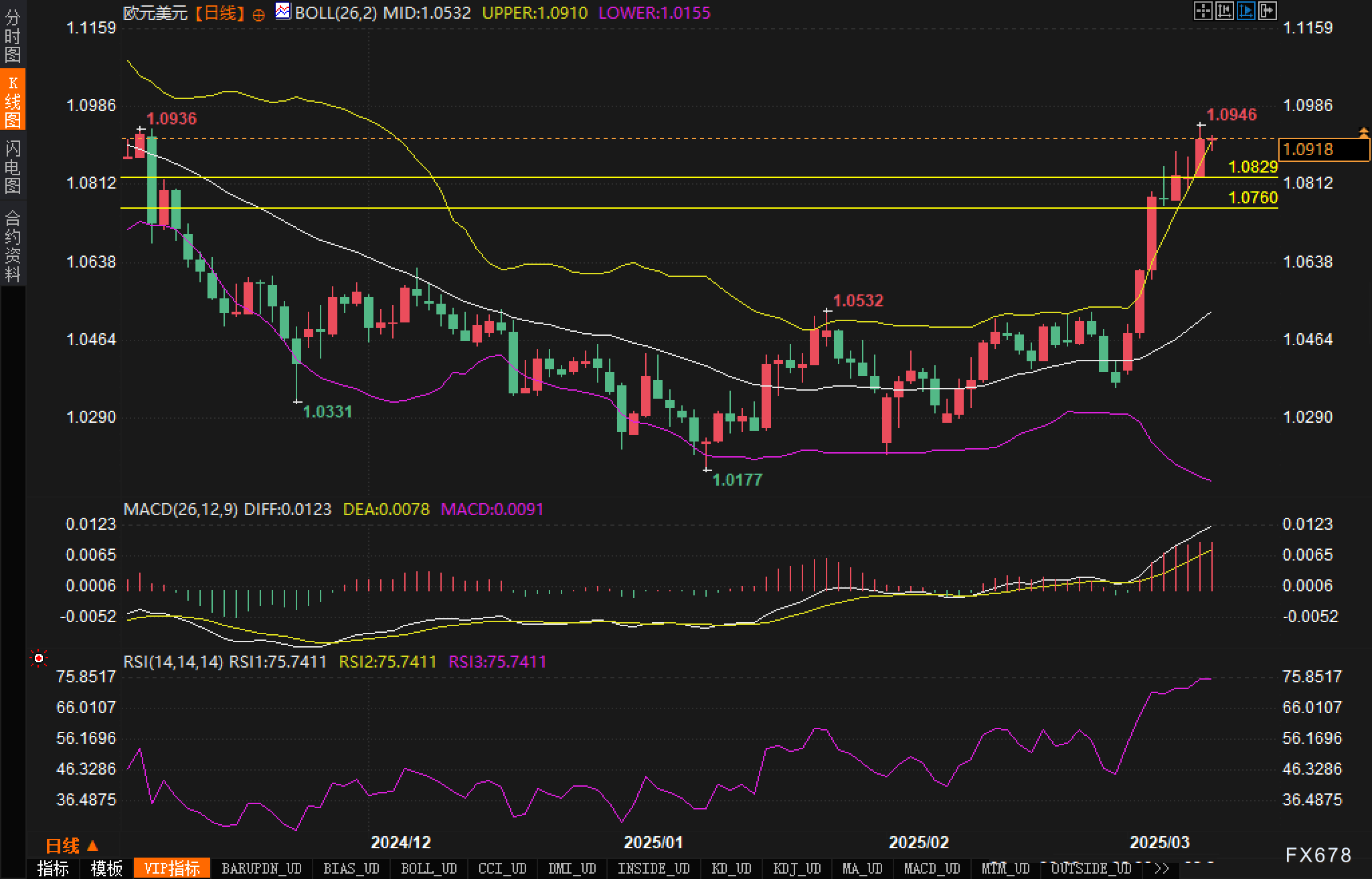 从技术面分析来看,欧元/美元近期整体呈现显著的上涨趋势,但短期上行遇阻迹象明显,需警惕回调风险。从日线图分析,欧元/美元近日成功突破1.0829关键阻力位,显示多头意愿坚决,且突破1.0900整数心理关口后一度达到1.0946四个月新高。不过在高位附近明显遇阻,K线连续收出上影线,这暗示短期高位存在较强的抛压,多空双方在此位置分歧加剧。RSI相对强弱指数在高位处于超买区域(75附近),存在技术性调整需求。