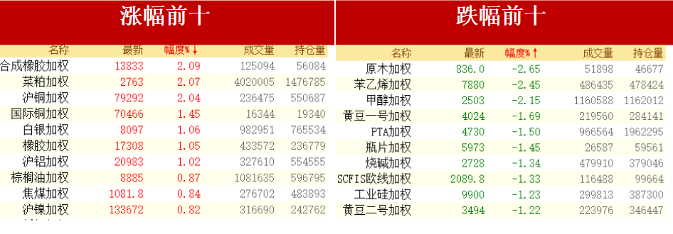 午盘收盘,合成橡胶、沪铜、国际铜涨超2%,菜粕、沪铝、沪银、天然橡胶涨超1%。跌幅方面,原木、苯乙烯(EB)、甲醇跌超2%,烧碱、豆一、PTA跌超1.5%。