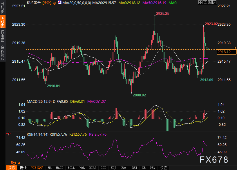 现货黄金短线上涨6美元,报2918.46美元/盎司,反映避险资金对降息预期的追捧。