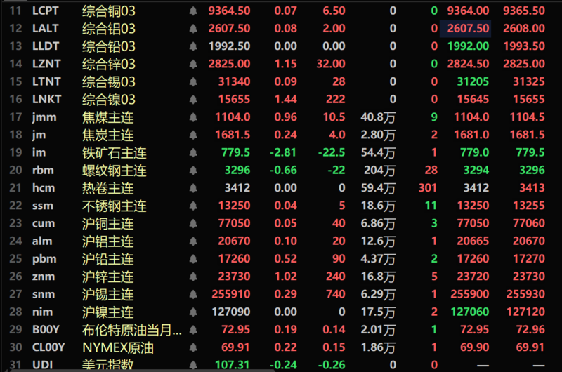 截至日间收盘,内盘金属多飘红,沪锌以1.02%的涨幅领涨。沪铅涨0.52%,沪锡涨0.29%。沪铝、沪铜微涨。沪镍平于127090元/吨。氧化铝主连跌0.65%。