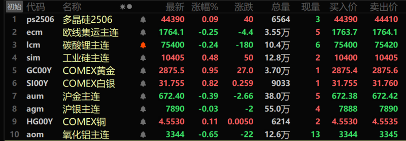 此外,工业硅主连涨0.48%,多晶硅主连微涨,碳酸锂主连跌0.24%。欧线集运主连跌0.25%。