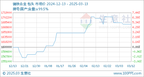 3月13日,生意社镝铁合金基准价为1680000.00元/吨,与本月初(1685000.00元/吨)相比,下降了-0.30%。