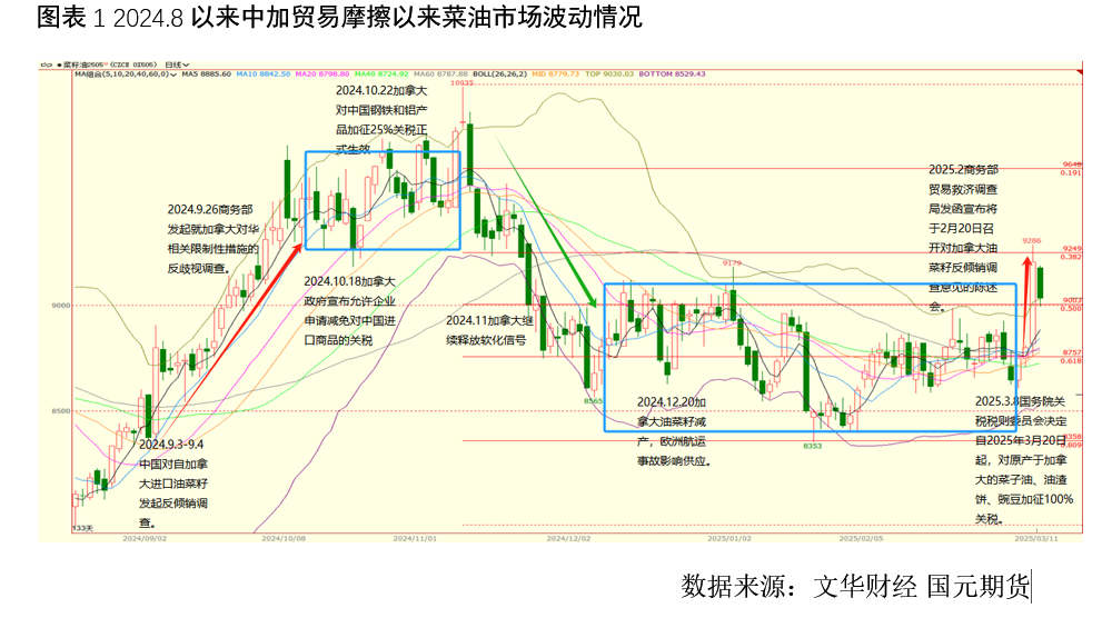 由于加征关税幅度超出市场预期,市场对国内后市菜粕供应忧虑更强,给予市场情绪面炒作空间,国内菜粕、菜油急速拉涨,其中菜粕期货涨幅强于菜油期货。本轮中加贸易关系变化始自于2024年8月底,加拿大政府发布公告称,将对中国产电动汽车征收100%关税,以及对产自中国的钢铝产品征收25%的关税。同年商务部对加拿大采取的相关限制措施发起“反歧视调查”。其中作为中加贸易的关键大宗商品,市场预期菜籽、菜粕可能成为反制措施的落脚点。市场情绪随之被点燃,带动国内菜系品种拉涨。不过进入11月之后,随着加方不断释放软化信号,国内对菜系供应的忧虑逐渐降温。2月底,中加举行反倾销调查意见陈述会,市场忧虑情绪再度升温。3月8日,中国宣布对自2025年3月20日起,对原产于加拿大的菜子油及油渣饼等加征100%关税。