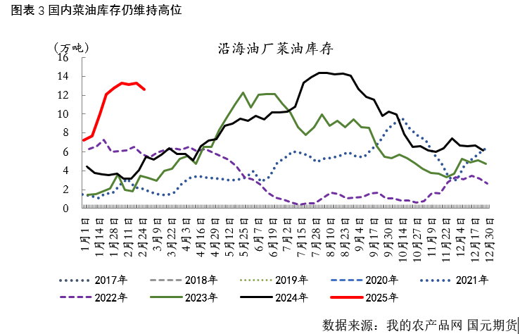 2025年以来,国内菜籽进口量出现明显回落趋势。据Mysteel调研显示,2025年2月,沿海地区进口菜籽预估到港船数2条,菜籽数量约13万吨,2025年3月,沿海地区进口菜籽预估到港船数4条,菜籽数量约26万吨。2025年2月以来,随着进口菜籽季节性减少,国内菜籽压榨维持较低水平。整体来看,国内菜油库存出现回落态势。根据钢联调研显示,截止到2025年3月7日,沿海地区主要油厂菜籽库存为42.5万吨,较上周增加2.9万吨;菜油库存为12.69万吨,较上周增加0.06万吨;未执行合同为14.5万吨,较上周减少0.6万吨。