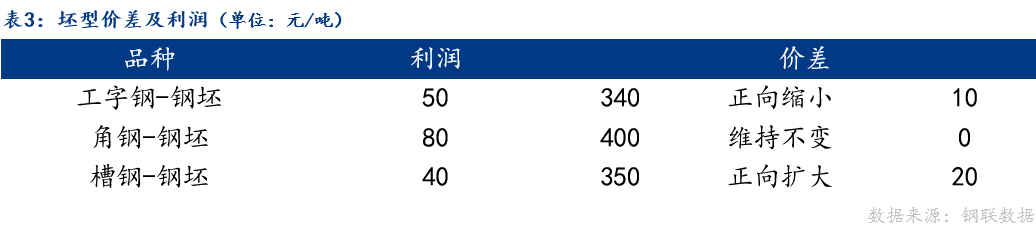 从坯型价差来看,工字钢与钢坯价差正向缩小,槽钢与钢坯价差正向扩大。