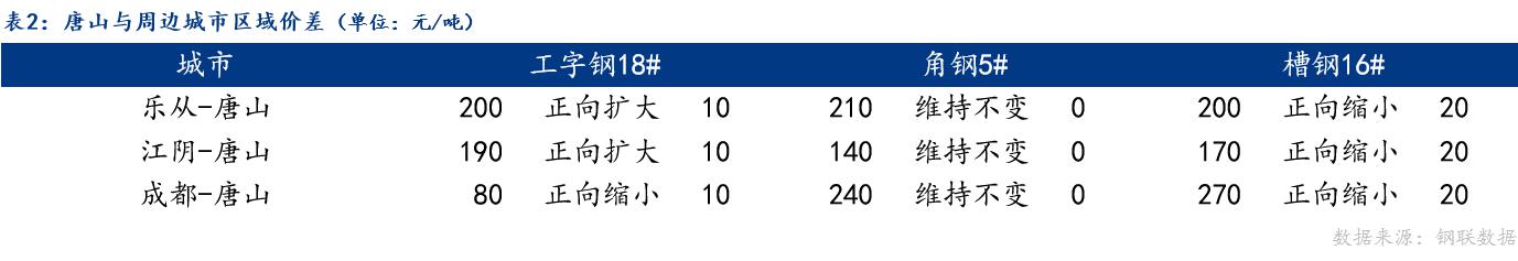 从区域价差来看,唐山工字钢与乐从、江阴工字钢价差正向扩大;乐从、江阴、成都槽钢与唐山槽钢价差正向缩小;成都工字钢与唐山工字钢价差正向缩小。