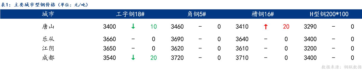 今日型钢价格主稳运行,唐山工字钢、成都工字钢价格较上一交易日价格下跌10-20元/吨;唐山槽钢价格较上一交易日价格上涨20元/吨。