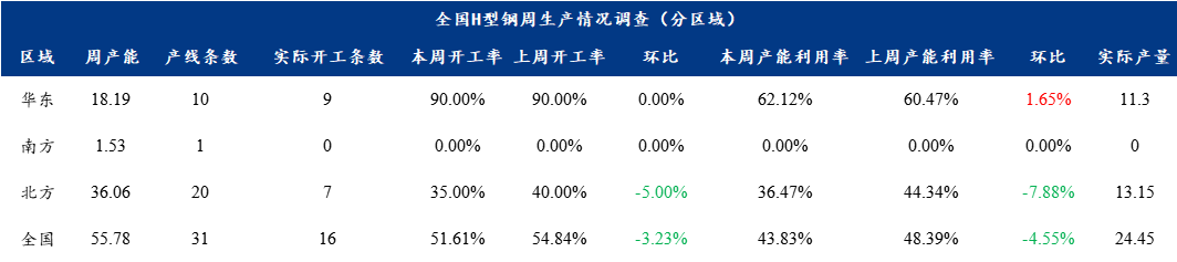 Mysteel监测的全国22家H型钢生产企业中,本周开工率51.61%,周环比下降3.23%;钢厂周实际产量24.45万吨,周环比下降9.41%;钢厂产能利用率43.83%,周环比下降4.56%;库存19.6吨,周环比下降5.08%。
