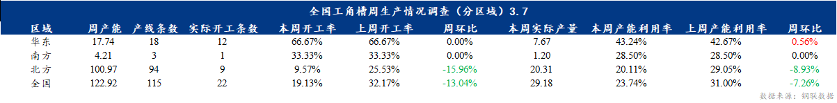 本周全国工角槽钢厂开工率19.13%,较上周(32.17%)减少13.04%,产能利用率23.74%,较上周(31.00%)减少7.26%。本周全国工角槽产量29.18吨,较上周(38.1)减少8.92万吨;本周全国工角槽钢厂厂内库存91.84万吨,较上周(106.7)减少14.96万吨。