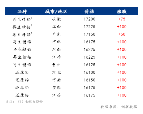 安徽市场A企业再生精铅含税价17225元/吨出厂无成交,反馈下游仍存压价情绪,双方价格未有谈妥。