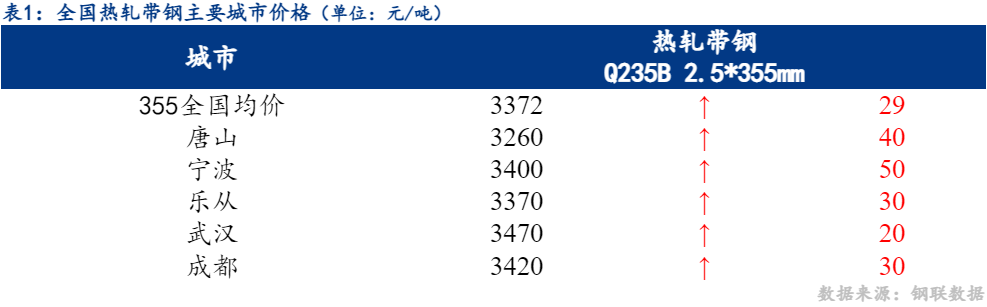 13日热轧带钢全国主要城市价格震荡趋强,截至发稿时2.5*355mm热轧带钢均价3372元/吨,较昨上涨29元/吨,其中2.5*355mm主要城市报价为唐山3260元/吨,宁波3400元/吨,乐从3370元/吨。