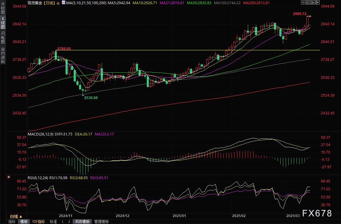 汇通财经APP讯——周五(3月14日)亚市早盘,现货黄金高位震荡,目前交投于2986.08美元/盎司附近。金价周四飙升逾50美元,收报2988.64美元/盎司,周五小幅刷新纪录高位至2989.72美元/盎司,接近每盎司3000美元这一关键里程碑,受关税不确定性上升和对美联储放宽货币政策的押注推动。