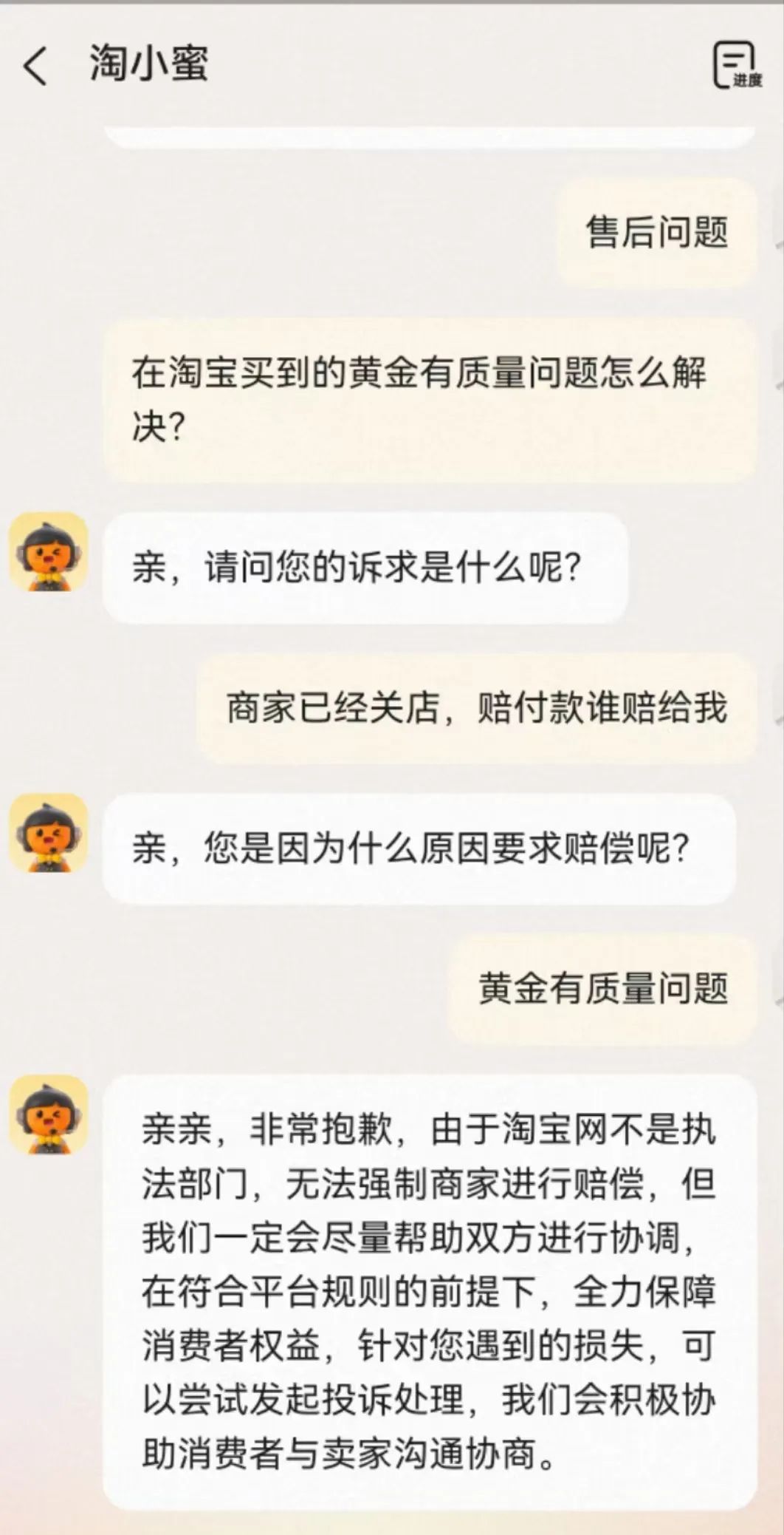 时代周报记者针对“买到有质量问题的黄金商品怎么办”向淘宝官方客服进行询问,客服回复称,“非常抱歉,由于淘宝网不是执法部门,无法强制商家进行赔偿,但我们一定会尽量帮助双方进行协调,在符合平台规则的前提下,全力保障消费者权益,针对您遇到的损失,可以尝试发起投诉处理,我们会积极协助消费者与卖家沟通协商。”