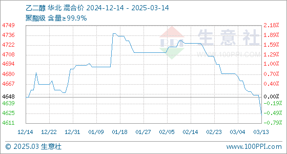 3月14日生意社乙二醇基准价为4623.33元/吨