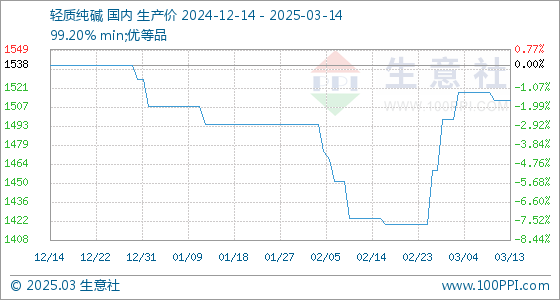 3月14日,生意社轻质纯碱基准价为1512.00元/吨,与本月初(1498.00元/吨)相比,上涨了0.93%。