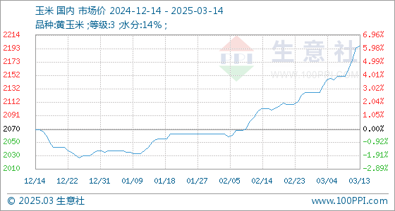 3月14日,生意社玉米基准价为2197.14元/吨,与本月初(2127.14元/吨)相比,上涨了3.29%。