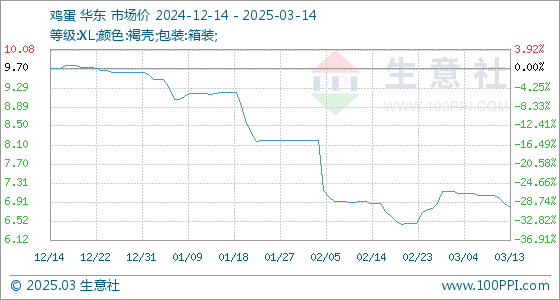 3月14日,生意社鸡蛋基准价为6.80元/公斤,与本月初(7.13元/公斤)相比,下降了-4.63%。