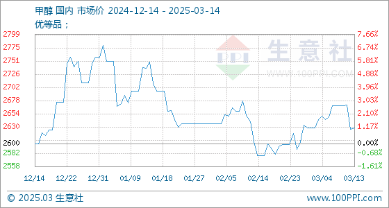 3月14日,生意社甲醇基准价为2628.33元/吨,与本月初(2629.17元/吨)相比,下降了-0.03%。