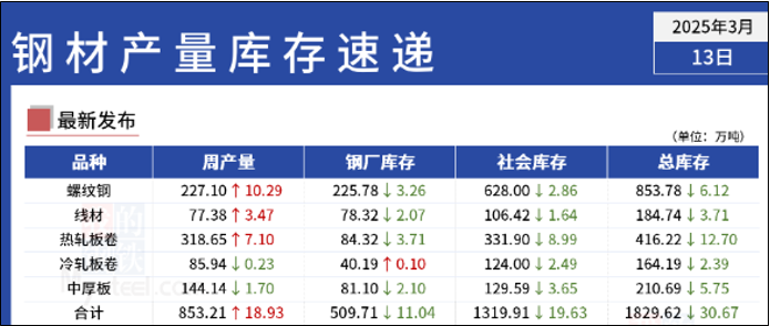 Mysteel3月13日资讯显示,本期螺纹实际产量227.1万吨,环比增加10.29万吨;钢厂库存为225.78万吨,环比减少3.26万吨;社库628万吨,环比降2.86万吨;总库853.78万吨,环比减少6.12万吨,表需233.22万吨,环比增加12.87万吨。