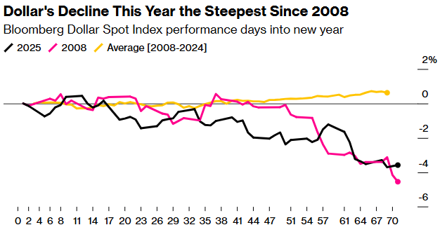 美元已经经历了自全球金融危机引发美国经济衰退以来最糟糕的一年开局,摩根士丹利认为,随着人们对美国经济健康状况的担忧加剧,美元将面临更多麻烦。该行宏观策略师周四警告客户,在美国总统特朗普的4月2日关税最后期限到来之前,联邦政府关门、美国经济增长放缓以及海外资产价值上升的风险都将拖累美元走低。媒体衡量美元健康状况的指标在2025年迄今已下跌逾3%,这是该指标自2008年以来最糟糕的年度表现。
