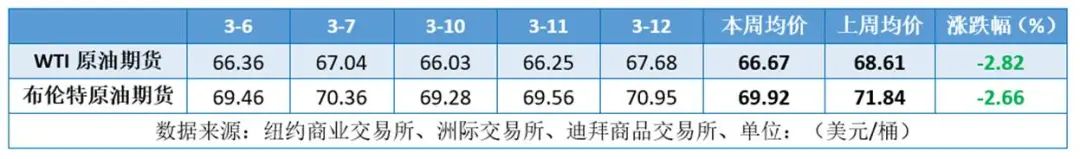 导言:本周(3.6-3.12),原油整体呈现低位震荡的走势。WTI本周均价66.67美元/桶,较前一周下跌1.94美元/桶,或-2.82%。周内,导致油价承压下跌的因素有:OPEC原油供应增加的预期以及投资者对经济以及能源需求前景的担忧情绪升温。另一方面,对油价起到支撑的因素有:技术面的反弹支撑以及美国成品油库存减少。
