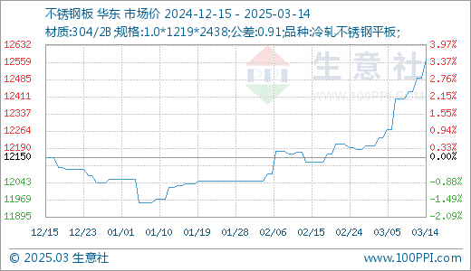 据生意社价格监测,本周不锈钢价格小幅上涨。截止3月14日,现货304/2B不锈钢平板1.0*1219*2438(公差0.91)的日均价为现报价12571.43元/吨,较周初上涨1.13%,同比下跌2.41%。