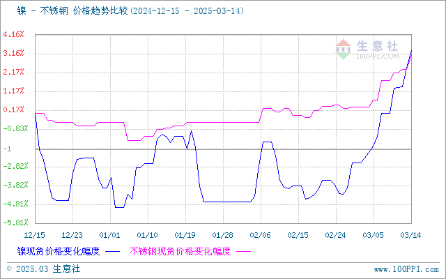 据生意社价差分析工具显示,镍和不锈钢价格基本相似,现在价格都大幅上涨。