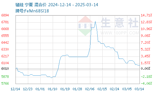 本周因前期盘面高位工厂持续套保,目前交割库存较满,期现公司出货心态积极,市场低价货源较多,锰硅现货价格表现低迷。根据生意社商品行情分析系统的数据显示,本周末硅锰在宁夏地区(规格为FeMN68Si18)的市场报价6000-6100元/吨左右,市场均价6070元/吨,与周初相比下跌0.98%。