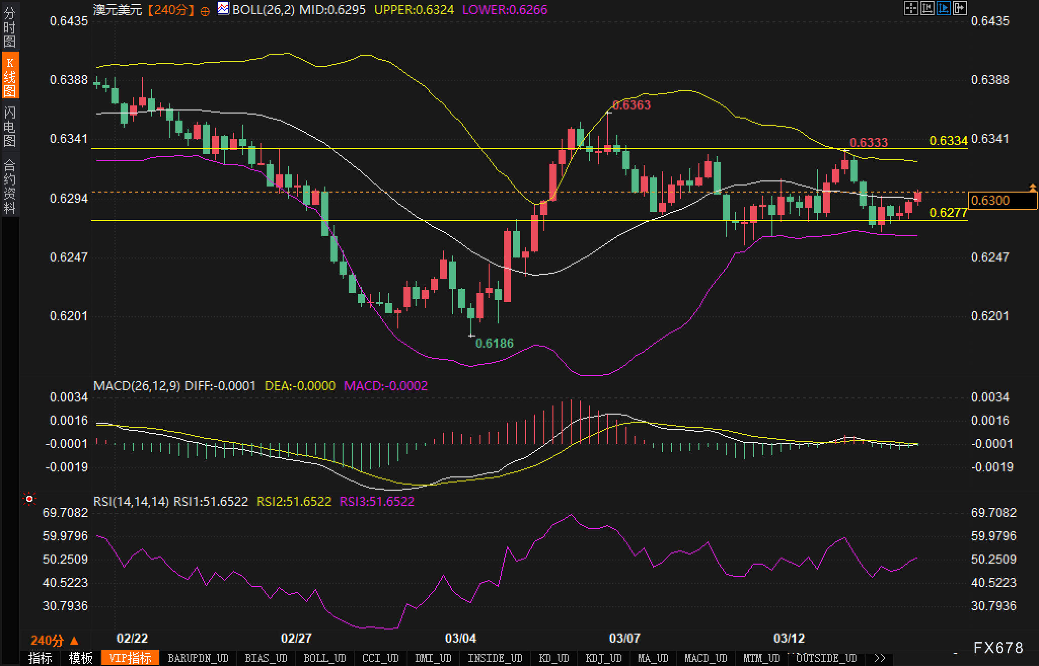 从4小时图表来看,澳元兑美元在0.6294附近形成关键支撑,近期反弹至0.6330附近,但未能维持涨势,目前交投于0.6300一线。布林带指标显示,当前价格位于通道中轨附近,显示短期内缺乏明确方向。