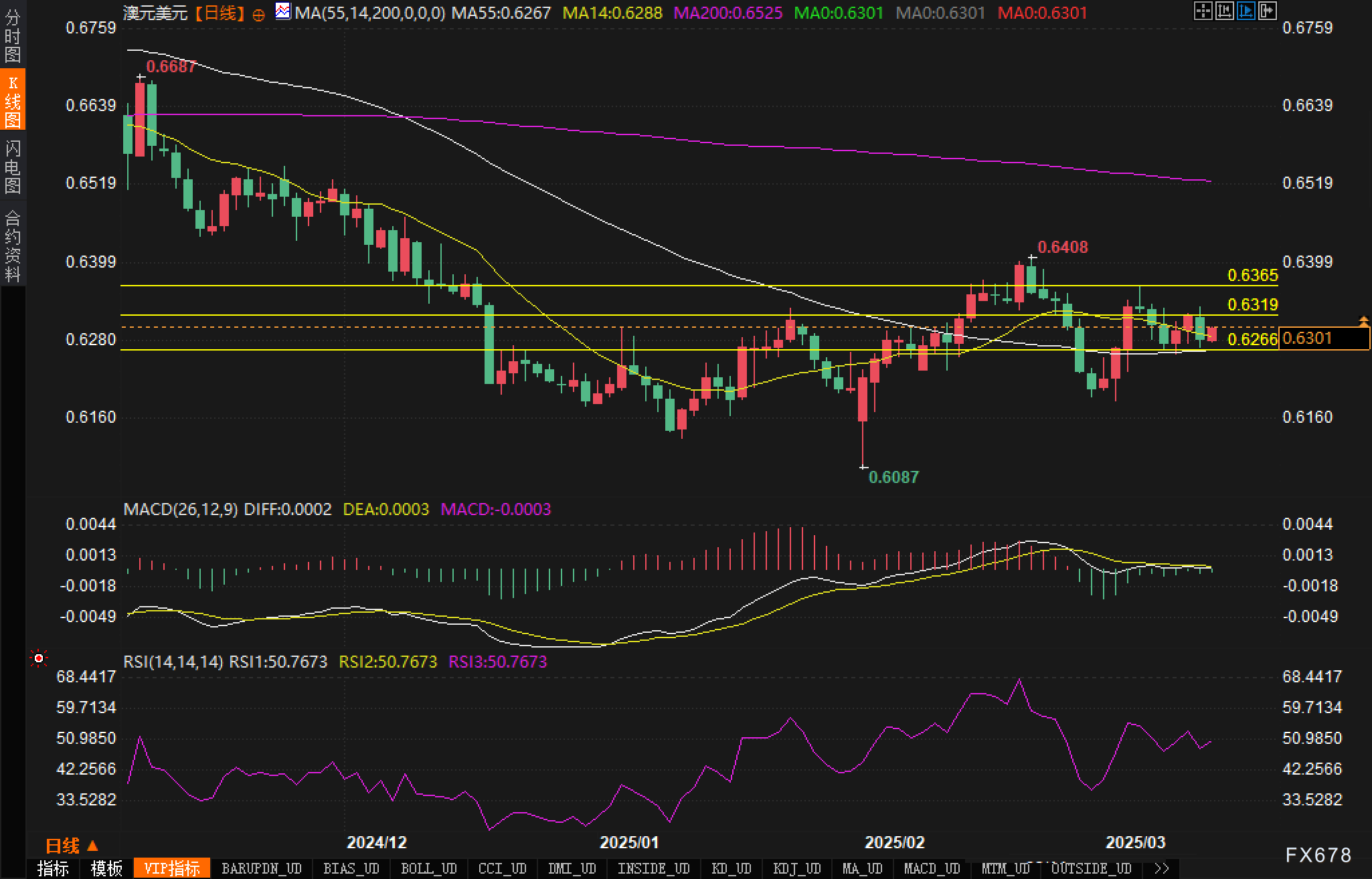 从日线图表分析,汇价正在MA55(0.6267)和MA200(0.6525)之间震荡,形成中期整理格局。RSI指标处于50.7左右的中性区域,同样暗示短期内方向不明。澳元目前面临0.6365的近期阻力位,若突破,则有望挑战0.6408水平;下方支撑位分别在0.6277和0.6240。