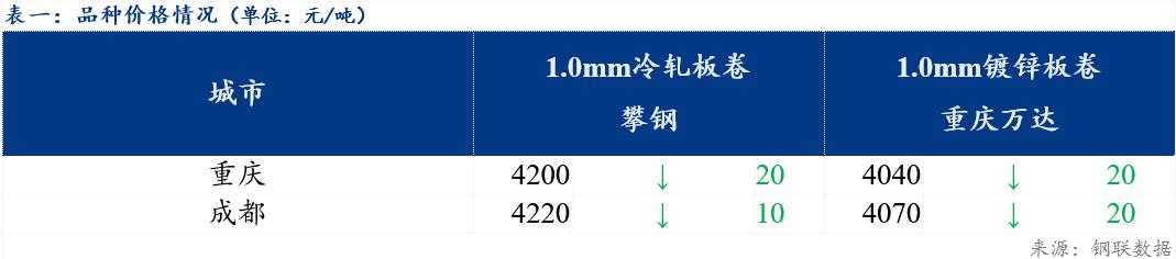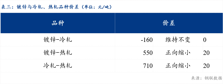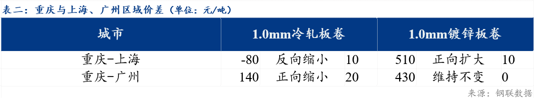 重庆、上海地区冷轧板卷区域价差反向缩小10元/吨,重庆、广州冷轧板卷区域价差缩小20元/吨;重庆、上海镀锌板卷区域价差扩大10元/吨,重庆、广州镀锌板卷区域价差维持不变。镀锌、冷轧品种价差维持不变;镀锌、热轧品种价差缩小20元/吨;冷轧、热轧品种价差缩小20元/吨。