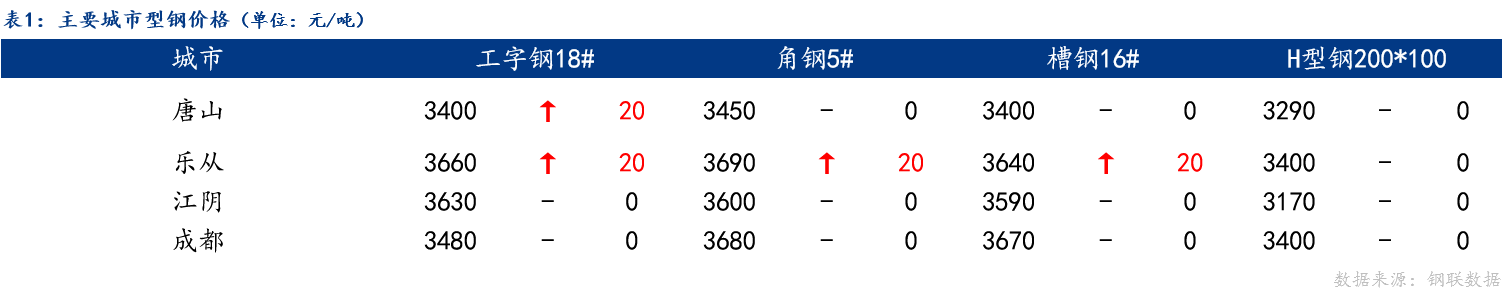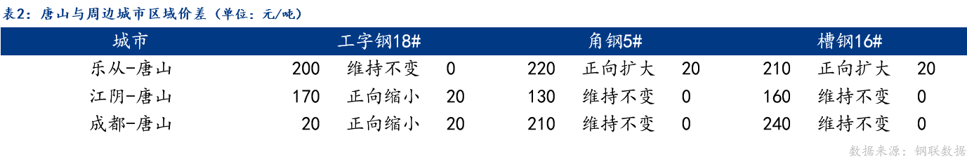 从区域价差来看,江阴成都工字钢与唐山价差正向缩小,乐从角钢槽钢与唐山价差正向扩大。