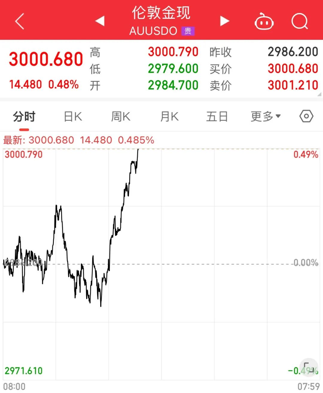 截至记者发稿,伦敦现货黄金突破3000美元大关,再度刷新历史新高,今年迄今累涨逾370美元,涨幅超14%。