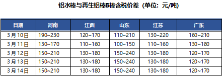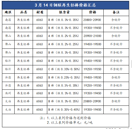 3月14日A00铝锭现货价华东20920,持平;华南20890,跌10;中原20780,跌10(单位:元/吨)。铝价震荡盘整,再生铝棒企业视排产周期调价接单,今日再生铝棒价格持平居多。