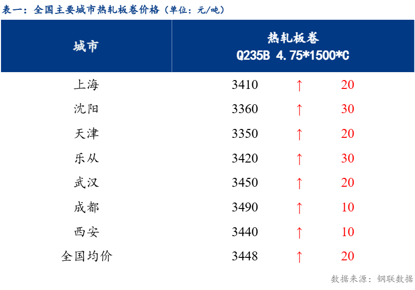 截止发稿时4.75热轧板卷全国均价3448元/吨,较上一交易日上涨20元/吨。 其中主要城市价格为上海3410元/吨,沈阳3360元/吨,天津3350元/吨,乐从3420元/吨,武汉3450元/吨,成都3490元/吨,西安3440元/吨。