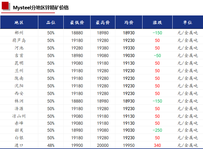 华北地区:内蒙古某锌锭生产企业50品位锌精矿加工费3600元/金属吨到厂。
