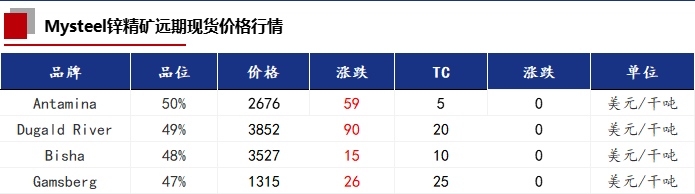 今日国内锌精矿加工费零星上调,波动幅度100-300元/金属吨。受锌价的影响,锌精矿价格上涨50元/金属吨。进口TC市场主流报价在10-30美元/干吨,暂无波动。